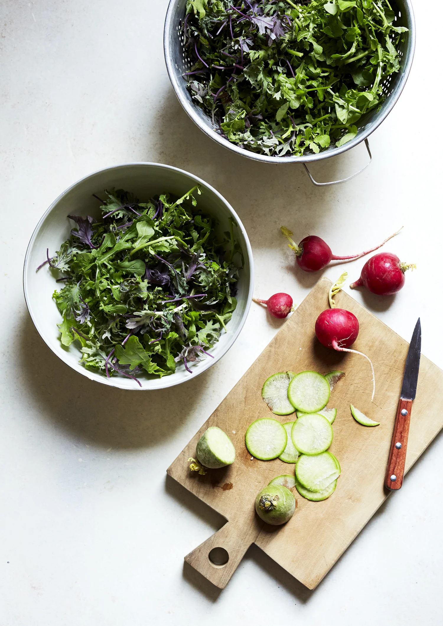 - 4 large handfuls of greens (I used a mix of baby kale, wild baby arugula and micro herbs)